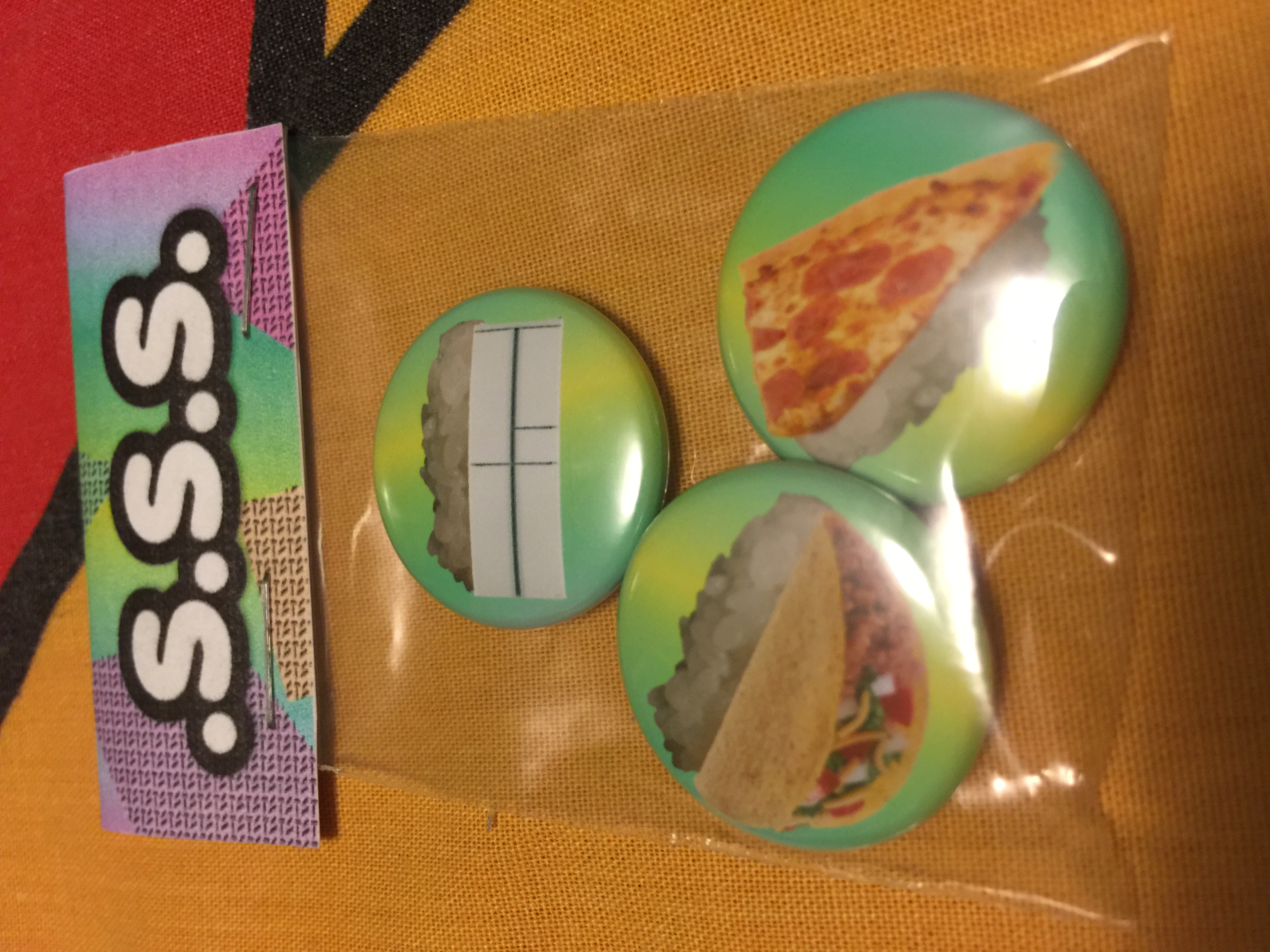 Strange Sushi Set. Strange things riding on sushi. 3 badge set. It will be cool if you put it on something, I think. Flavors included: * pizza * taco * refrigerator